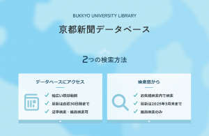 図書館で提供している「京都新聞データベース」が新しくなりました。これまで2025年(令和7年)4月以降の記事については、参考調査カウンターに申し出が必要でしたが、今後は、図書館以外の学内に設置パソコンや、リモートアクセスサービスを使い学内外で便利に閲覧いただくことができます。